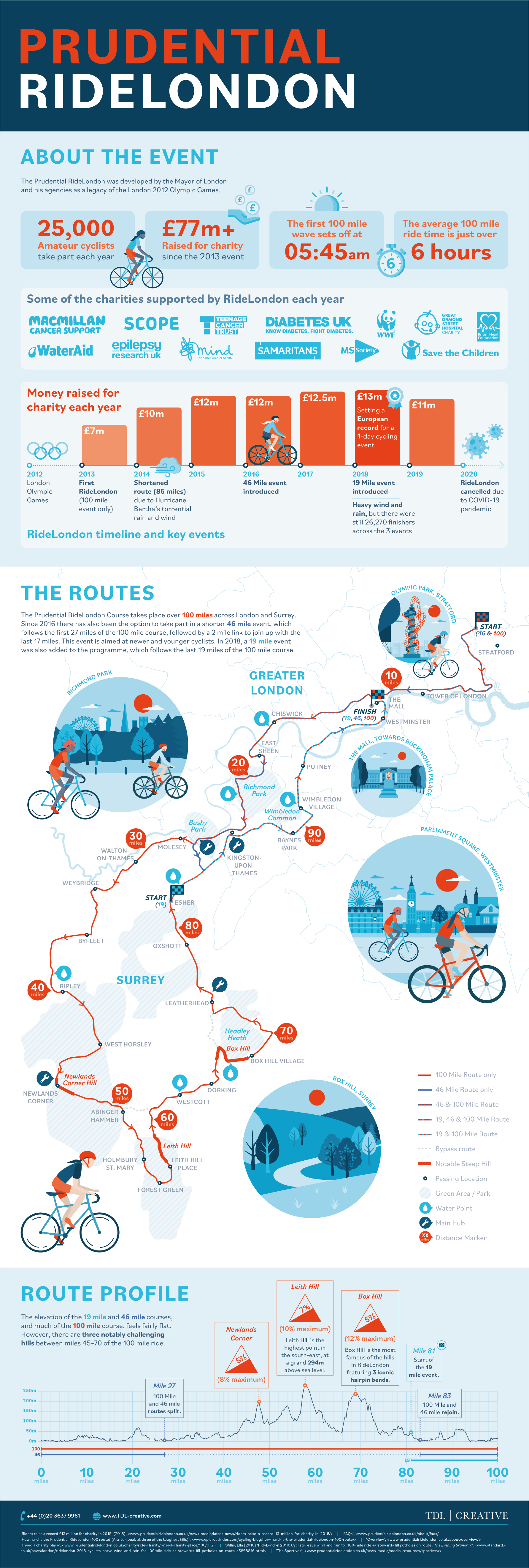 We wanted to commemorate 7 years of RideLondon – the world’s greatest festival of cycling – with a celebratory and informative graphic. There was a lot of data to visualise: statistics, the route maps and route elevation of the three event distances on offer. It was certainly a challenge finding a solution that would clearly display the three route options on one map!